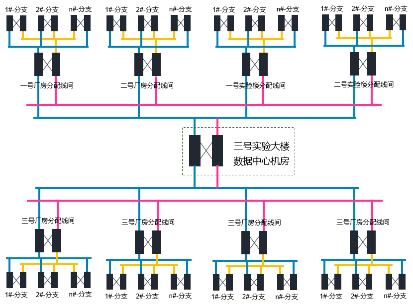 1、數(shù)據(jù)中心機房至匯聚中心至各樓棟分支機柜采用大對數(shù)電纜