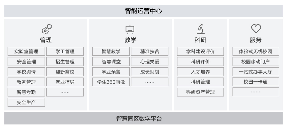 智能化智慧校園解決方案以物聯(lián)網(wǎng)、云計算、大數(shù)據(jù)、AI、移動互聯(lián)網(wǎng)等先進技術(shù)為基礎(chǔ),建設(shè)智能化智慧校園,統(tǒng)籌建設(shè)智能化一體化教學(xué)、管理與服務(wù)平臺。賦能科研創(chuàng)新、提高教學(xué)質(zhì)量和效率,培育優(yōu)質(zhì)人才。