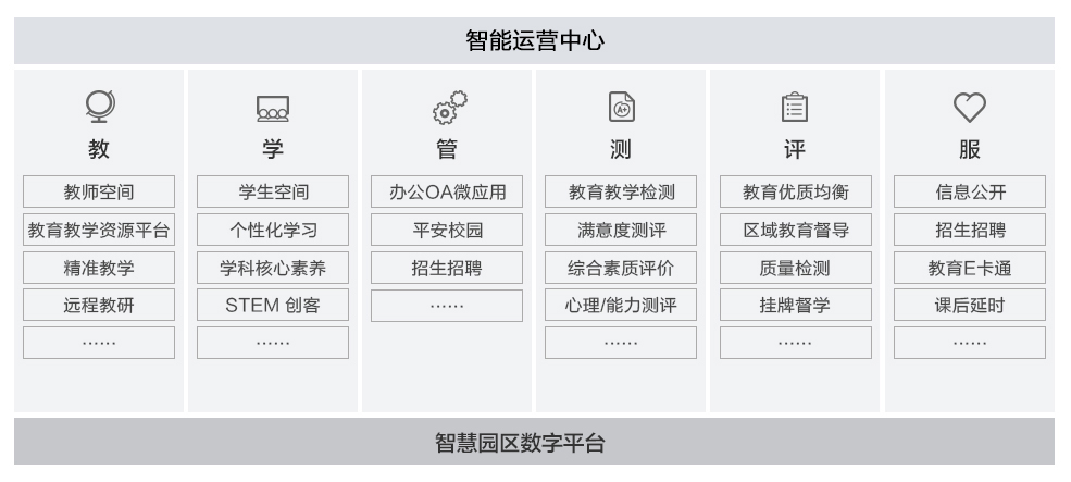 基礎(chǔ)教育是提高國民素質(zhì)和造就人才的基礎(chǔ)工程,從作坊式教育和工廠式教育逐步走向個性化教育發(fā)展中國的教育發(fā)展已經(jīng)發(fā)生了翻天覆地的變化。智能化校園解決方案以人為本,通過數(shù)字化技術(shù)實現(xiàn)從傳統(tǒng)教育向智慧教育轉(zhuǎn)變,從傳統(tǒng)校園向智慧校園轉(zhuǎn)變,圍繞教、學(xué)、管、測、評、服等六個方面,打造健康、安全、高效、創(chuàng)新的智慧校園;將各校園相關(guān)數(shù)據(jù)進行采集、匯聚、分析、服務(wù),實現(xiàn)區(qū)域教育、教學(xué)優(yōu)質(zhì)資源的共享。