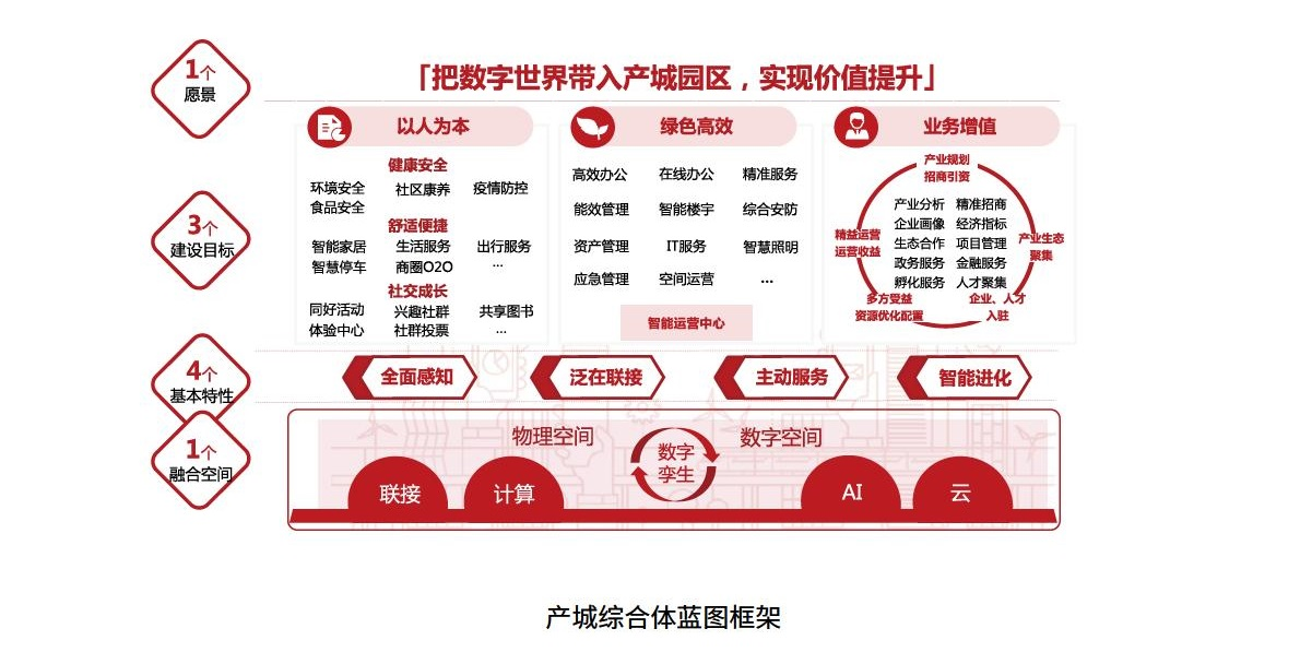 智慧園區(qū)藍圖框架,應用于指導產(chǎn)城綜合體園區(qū)的智慧化規(guī)劃與建設。
