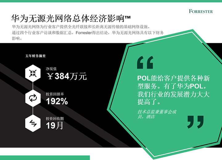 2022年上半年,華為委托權(quán)威咨詢公司Forrester進(jìn)行了《華為無源光網(wǎng)絡(luò)總體經(jīng)濟(jì)影響™》研究。在本研究中,F(xiàn)orrester通過客戶訪談,以專有方法論分析部署華為無源光網(wǎng)絡(luò)(Passive optical LAN,POL)方案對企業(yè)帶來的經(jīng)濟(jì)影響。研究結(jié)果顯示,企業(yè)使用華為POL五年投資回報率達(dá)192%,投資回報周期為19個月。