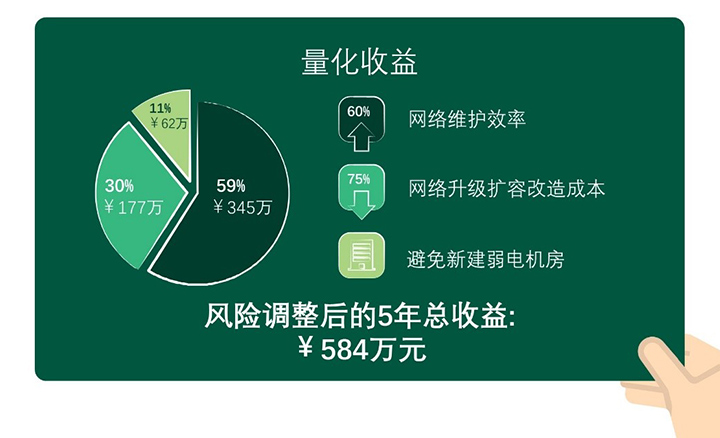 擴(kuò)容建設(shè)投資:網(wǎng)絡(luò)升級擴(kuò)容基于POL簡架構(gòu)、光纖輕便靈活可以節(jié)約75%建設(shè)投資,五年總收益現(xiàn)值超177萬元人民幣。
